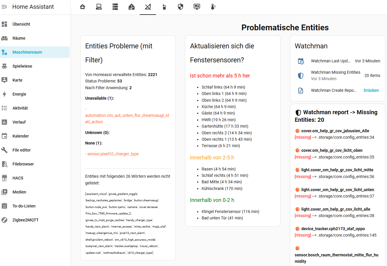 Wartungs-Dashboard klingt ja gut (und durchaus interessant), aber mit drei Klicks habe ich das über "Einstellungen - Geräte & Dienste - Entitäten” mit dem Filter auch schnell rausgefunden. Dann muss ich nur noch wissen, welche Entität in welcher Automation/Berechnung verwendet wird (hier wäre es dann interessant, wenn mir das Dashboard die Entitäten noch mal extra markiert oder nur die listet, die auch wirklich irgendwo verwendet werden)
