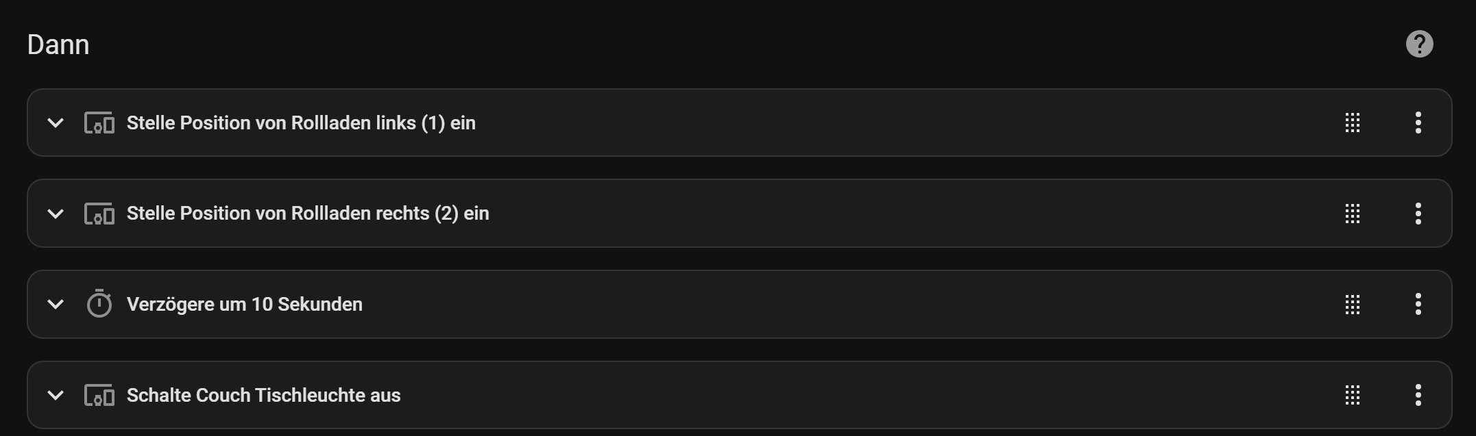 Diese Abläufe würde ich gerne auf Knopfdruck automatisieren (nicht völlig automatisch, dafür bin ich zu ‚unstet‘ und stehe immer mal wieder unterschiedlich auf), habe aber überhaupt keine Idee wie ich das in HA realisieren kann. In den Office Programmen hätte ich dafür einen Makro-Rekorder, schätze etwas ähnliches gibt es in HA wohl nicht, oder?