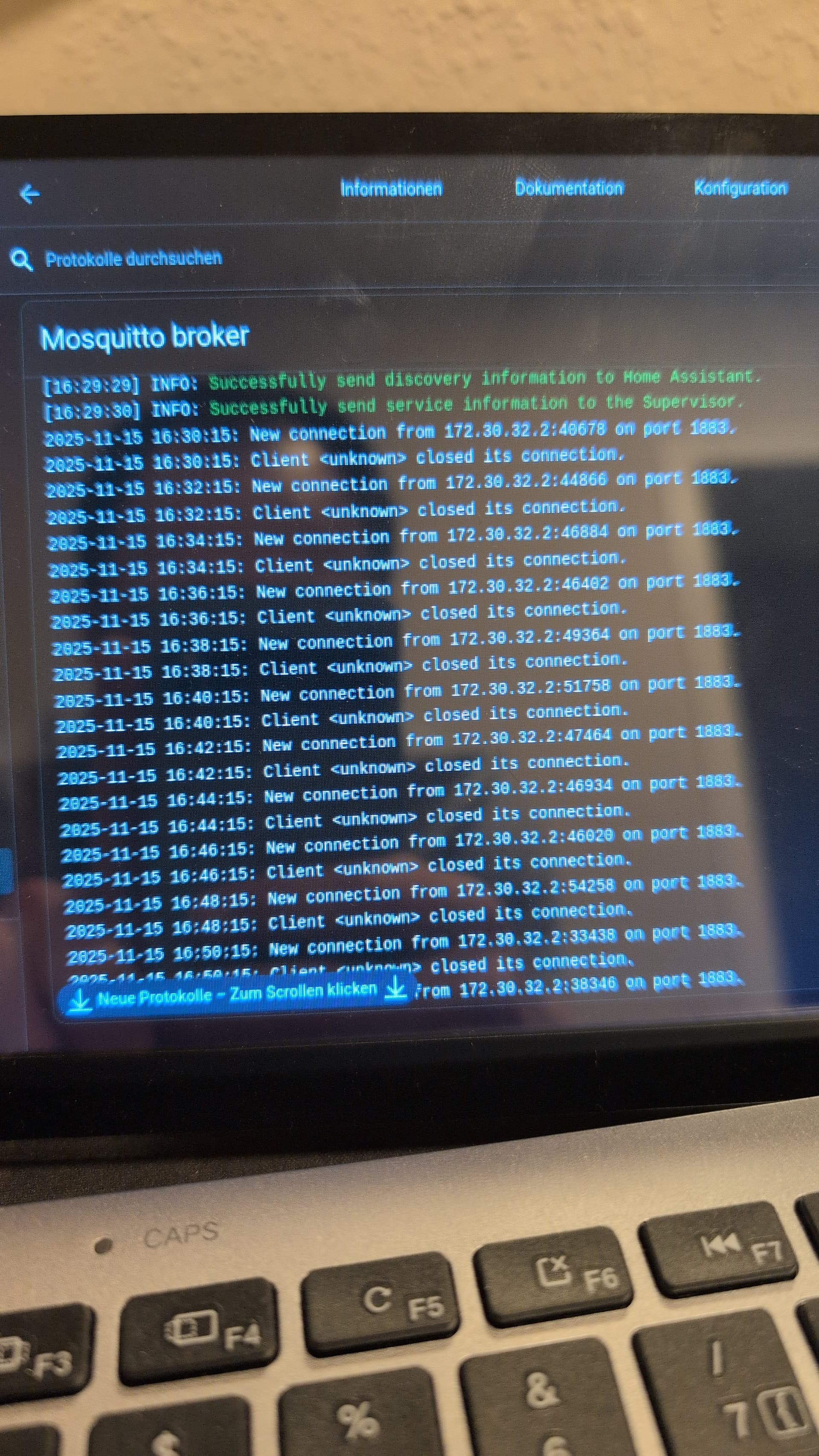 Mosquitto Broker installiert. In den Einstellungen habe ich nichts geändert. Hier ein Auszug vom Protokoll: