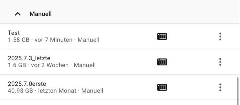 Mir ist heute aufgefallen, dass meine Backups auf einmal einen extremen Größen unterschied haben. Vorher war es immer um die 40gb, nun nur gute 1.6gb. Scheinbar ist es ab dem 2025.7.1 Backup so klein. Davor das manuelle Backup bei 2025.7.0 war noch normal groß.