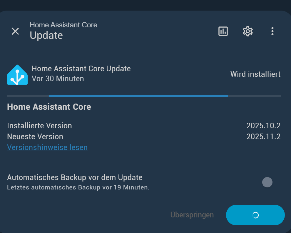 Anm.: Dadurch wenn Du jetzt von Deiner aktuellen Version 2025.10.2 ein Backup erstellen kannst, solltest Du dieses im Notfalls ja auch wieder installieren können. Trotzdem besteht natürlich ein gewisses Restrisiko und ich möchte nicht daran Schuld sein wenn/falls es hinterher ggf. noch schlimmer ist als im Moment. D.h. wenn machst Du das auf Deine eigene Verantwortung! D.h. das ist ganz allein Deine Entscheidung.
