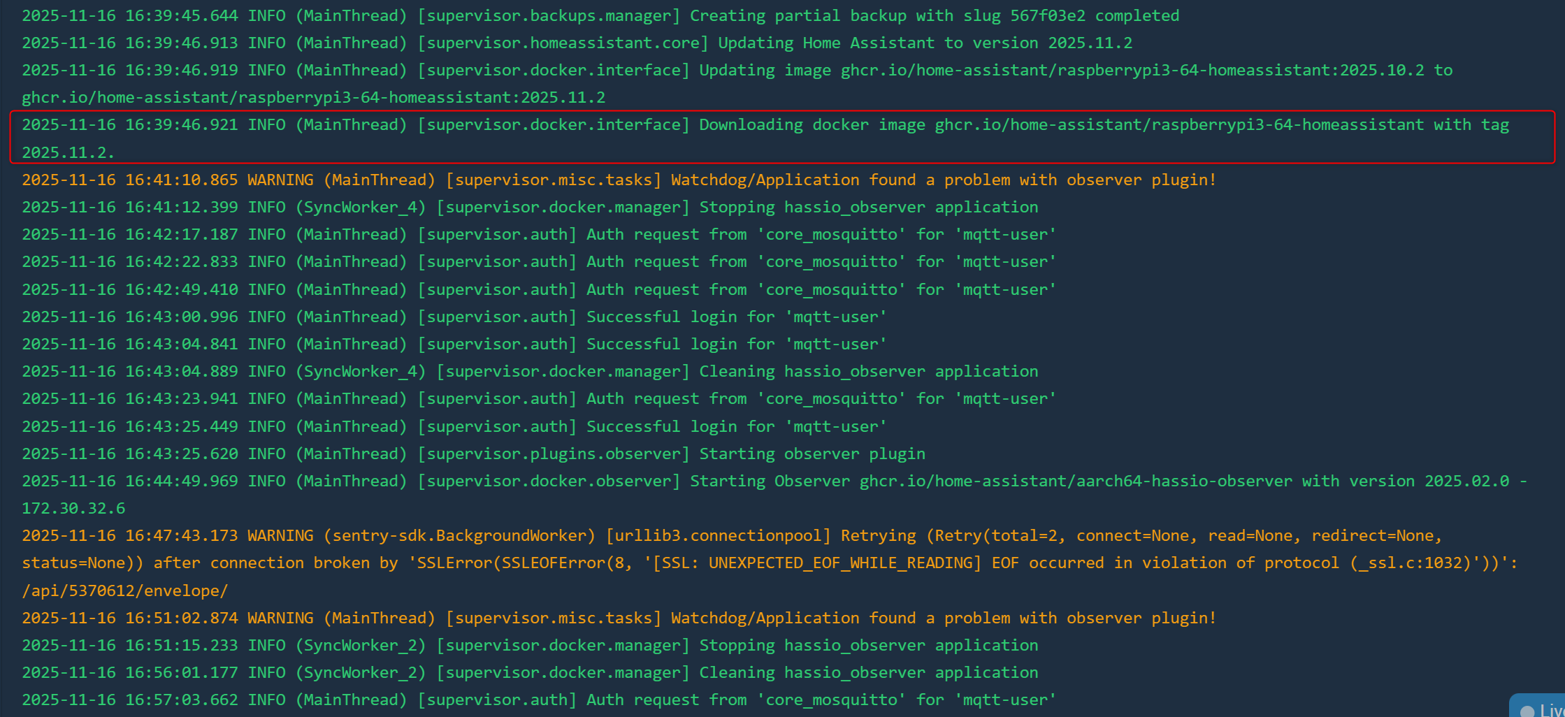 dann schon mal einen Blick auf das HA Core Protokoll werfen, ob dann da bereits irgendwelche eher außergewöhnlichen Probleme erscheinen. Dann einen Update-Versuch starten und dann wieder einen Blick auf die HA Protokolle werfen. Dann allerdings nicht nur auf der Core, sondern auch auf das Supervisor und Host Protokoll.
