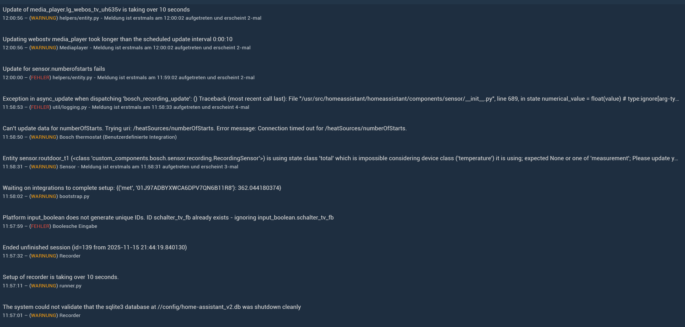 OK - ich vermute das Du um 11:57:01 zumindest einen HA Neustart gemacht hast, aber das was da jetzt in dem HA Core Protokoll auftaucht sind irgendwelche “normalen” Warnungen und Fehlermeldungen die irgendwelche Dinge unter HA verursachen und um die Du Dich natürlich auch mal kümmern solltest. Aber diese haben nichts mit Deinem Core-Update Problem zu tun. Daher hatte ich ja auch geschrieben das Du jetzt mal einen Update-Versuch starten solltest - was Du m.M.n. noch nicht gemacht hast - und danach einen Blick in die Protokolle werfen sollst. Also den HA Host einmal neu booten
