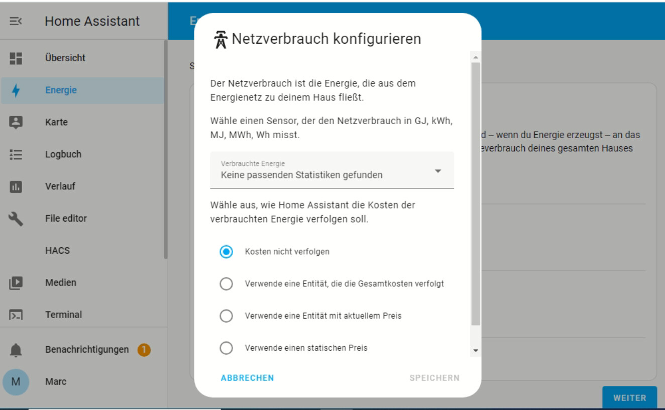 Kann im Energie Dashboard keinen Verbrauch hinzufügen, “Du hast keine Statistiken”