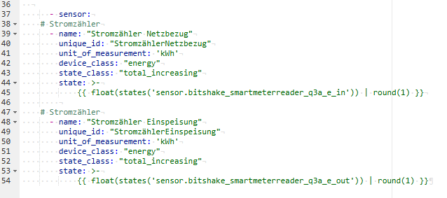 Wie bei deinem Doppelpost in dem anderen Thread bereits geschrieben, ist dein Code nicht korrekt. Prinzipiell sind die zusätzlichen Sensoren auch unnötig → Zählerstand in Energie Dashboard darstellen - Keine passenden Statistiken gefunden - - #6 von AlfB