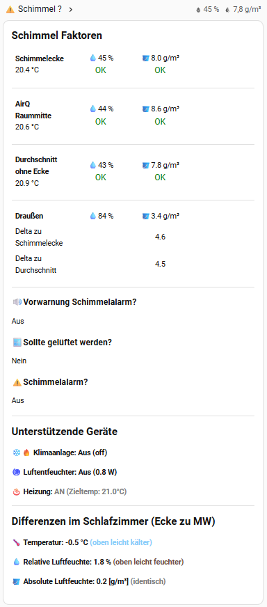 Am Ende des Beobachtens/Testens habe ich 2 Template Sensoren erstellt (Vorwarnung und Schimmelalarm). Diese triggern dann entsprechende Ansagen und Mails mit: Wir wollen keinen Schimmel mehr! Beweg Dich und lüfte bzw. Entfeuchter und/oder Klima Entfeuchtung anschalten (noch nicht komplett realisiert)