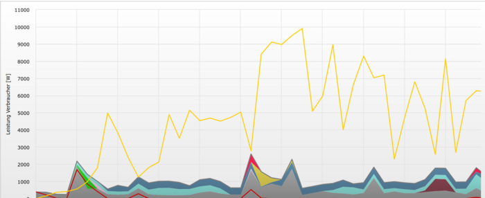 Jede Farbe in diesem Diagramm steht für den Stromverbrauch eines anderen Gerätes.