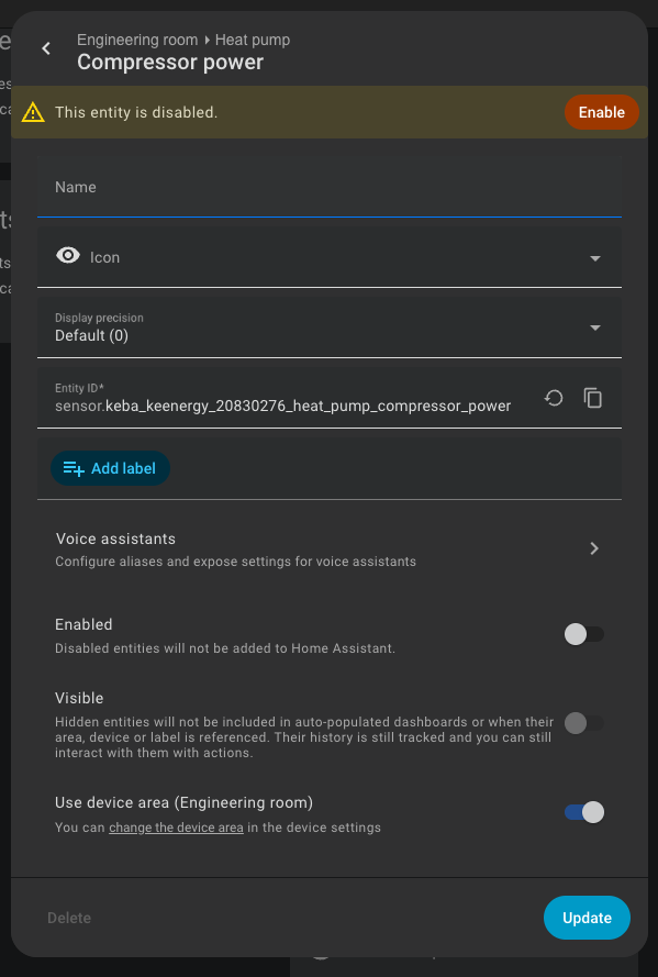Hallo, danke für die Integration. Ich hab einen nachträglich einen Energiezähler verbaut, welcher offiziell in der WP angeschlossen ist und mir online die Leistung und Energie anzeigt, nur leider wird die Leistung und Energie in der Integration als „deaktivierte“ Entitäten angezeigt, wie könnte ich diese aktivieren? BG Martin