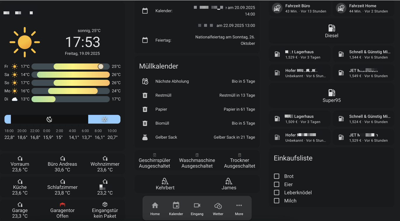 Ein Tablet (AllNet Android 15.6 POE inkl. FullyKioskBrowser) im Vorraum dient als meine HA Übersicht bzw. “Zentrale” in erster Linie soll es jedoch als reine Informationsquelle dienen. “Schalten und Verwalten” mache ich nur vom Handy (Shelly App oder PC aus).