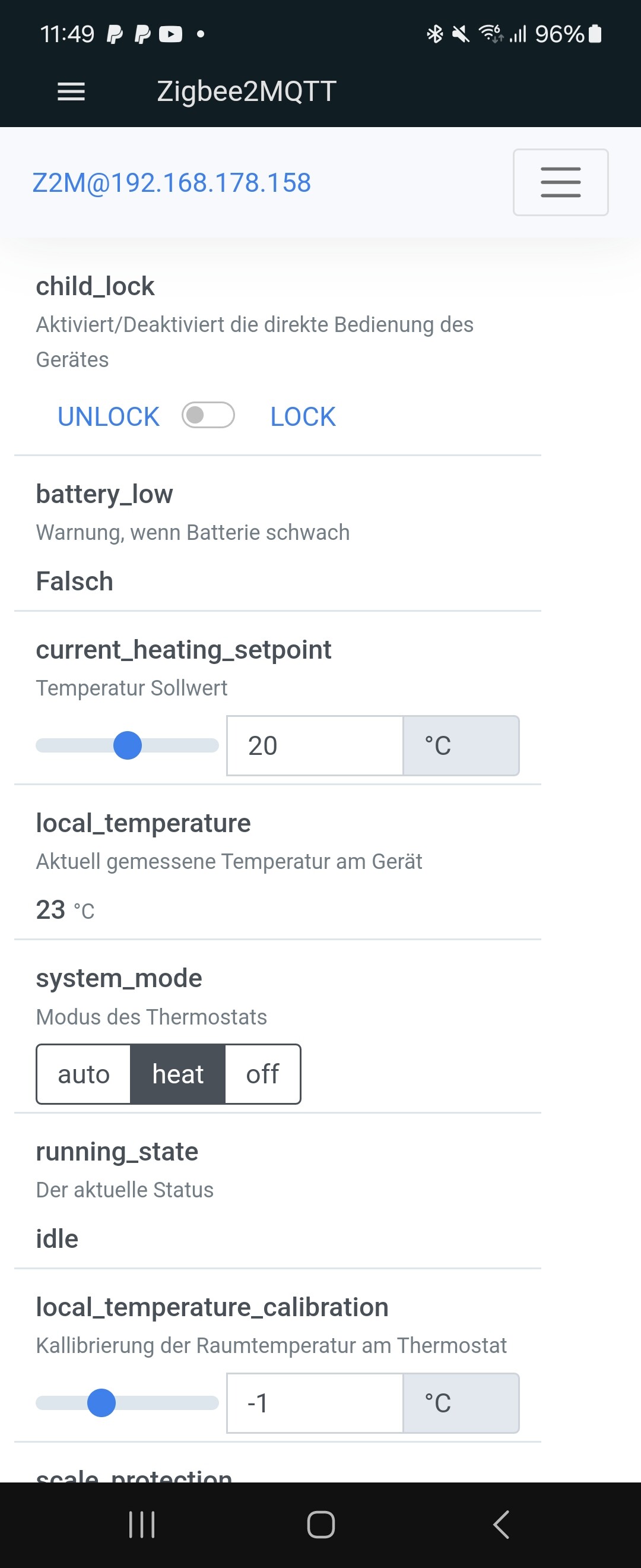 Es läuft über zigbeemqtt da steht eigentlich auch nur heizen und 20 Grad…