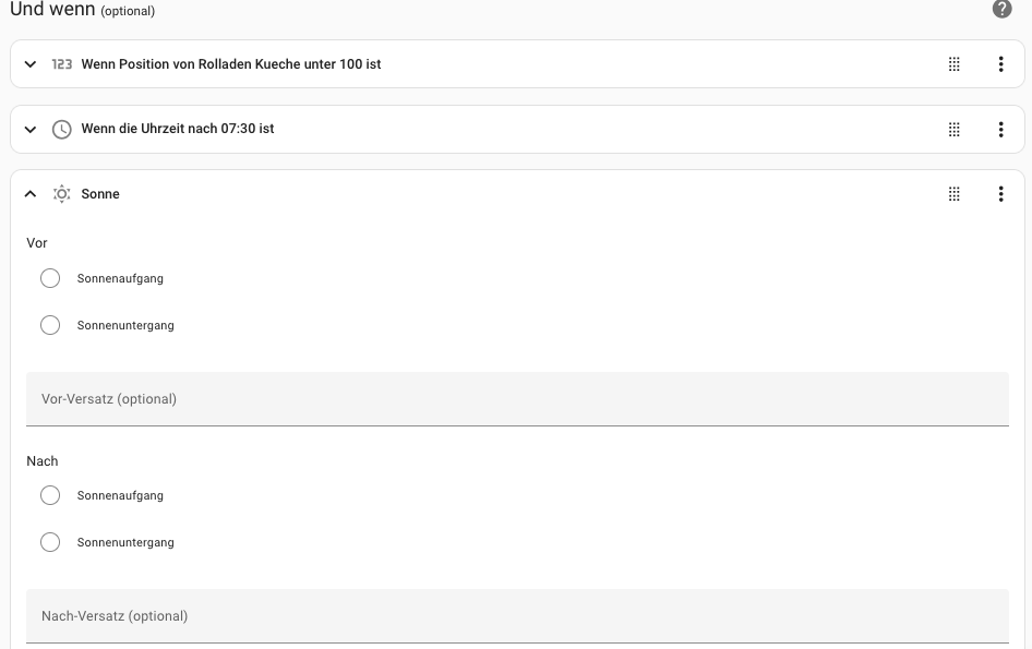 Ist der erste Trigger die Uhrzeit (Winter), dann ist es nicht nach Sonnenaufgang und es passiert nichts. Beim Trigger Sonnenaufgang (nach 7:30) passen die Uhrzeit und nach Sonnenaufgang, somit fährt der Rollo.