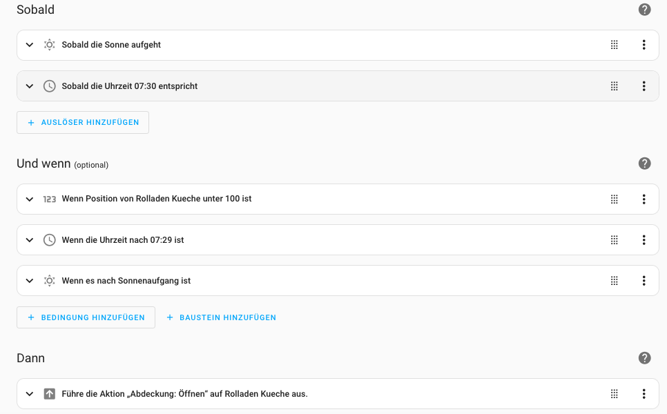 Meine Rolläden in der CCU2 ( Homematic ) fahren bei Sonnenaufgang aber nur nach 7:30 Uhr hoch. ( natütlich prüfe ich hier auch ob sie schon oben sind oder nicht ganz oben )