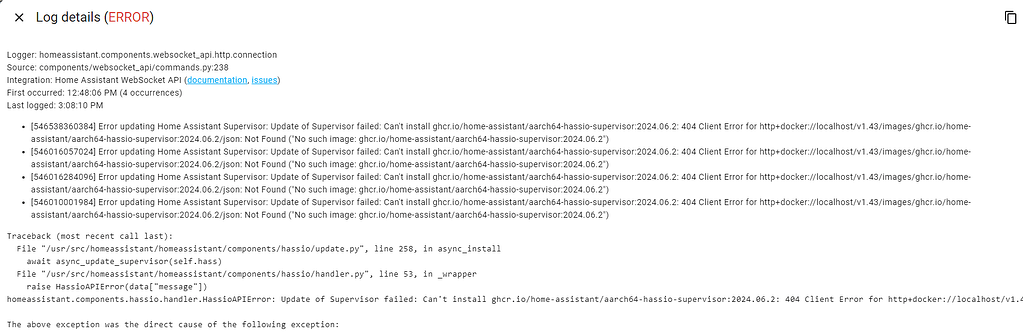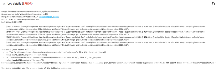 2025-05-19 08:54:21.238 ERROR (SyncWorker_7) [supervisor.docker.manager] Can't execute command: 404 Client Error for http+docker://localhost/v1.48/images/ghcr.io/home-assistant/generic-x86-64-homeassistant:latest/json: Not Found ("No such image: ghcr.io/home-assistant/generic-x86-64-homeassistant:latest")