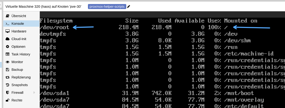 Hat leider etwas gedauert, bis ich alles zusammen hatte, aber jetzt habe ich Tastatur und Monitor dran, sehe das Problem - /root hat 100% Benutzung, ist also voll -, kann aber bisher nichts daran ändern.