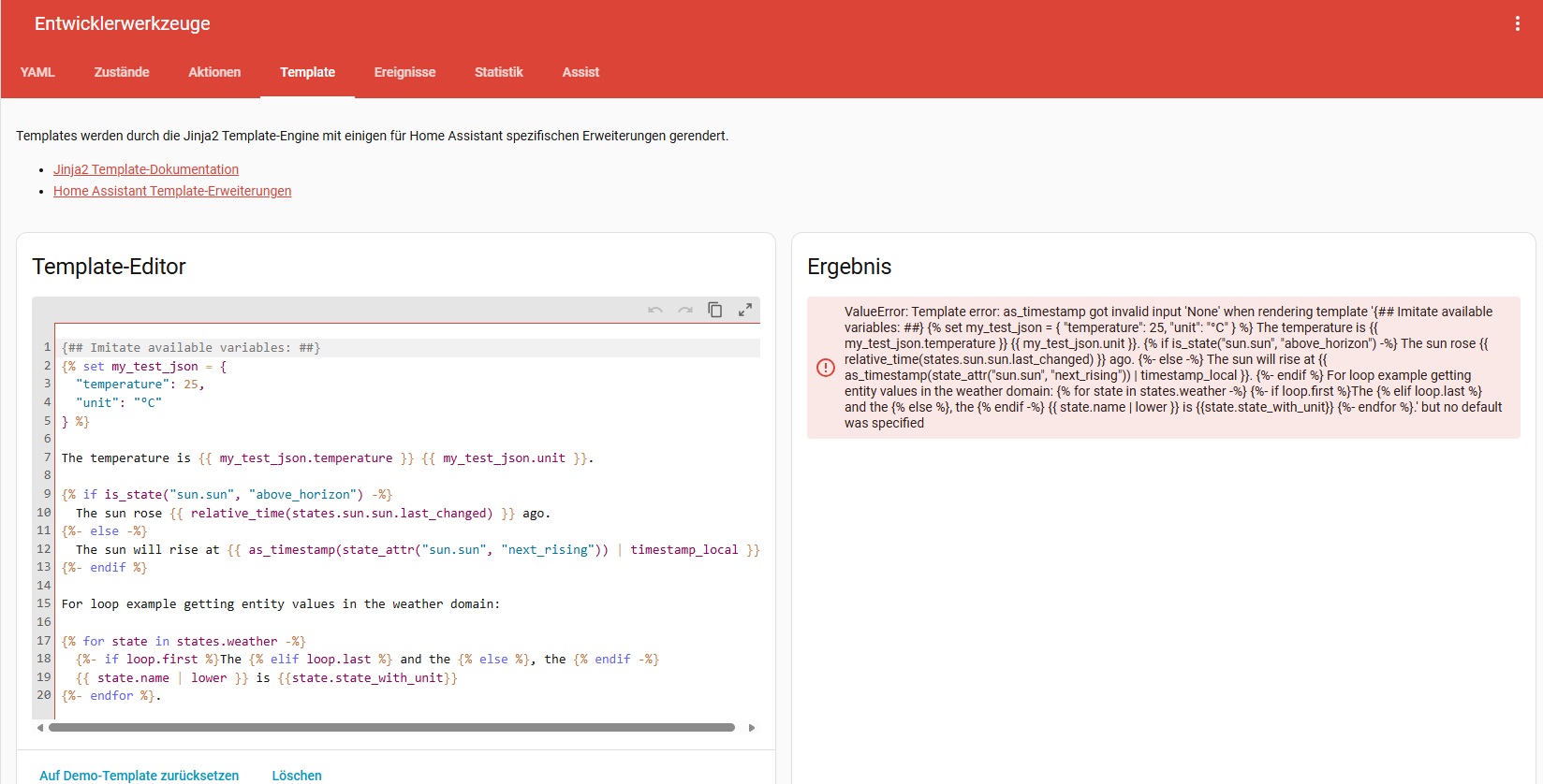 Im Zweifel kopier dieses Template (unter Windows) per STRG-A STRG-C, öffne einen Editor Deiner Wahl wie Notepad und füge es dort per STRG-V ein. Im Template Editor kannst Du dann auf Demo-Template zurücksetzen, dadurch sollte die Fehlermeldung verschwinden