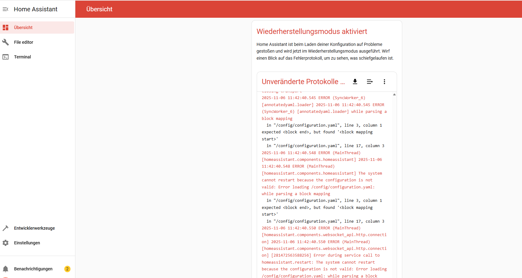 Zusatztipp: In den Entwicklerwerkzeugen gibt es unter YAML die Möglichkeit alle Konfigs vor dem Neustart zu prüfen. Das kann lebensrettend sein