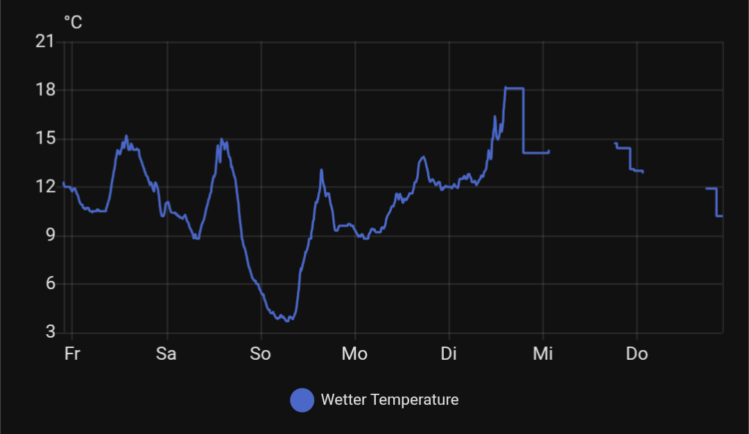 Hi, ich glaube ich habe das gleiche Problem. Ich habe v.a. Thermostate von Homematic IP, ebenfalls nur ein Access Point und daher die Cloud Integration. Am Dienstagnachmittag sind sämtliche Sensoren “eingefroren” und haben nur den gleichen Status anzeigt; nach Neuladen der Integration habe ich dann immer kurz neue Werte bekommen, dann sind die Sensoren gänzlich unavailable geworden. Hier bspw. die Außentemperatur, die ab Dienstagmittag verrückt spielt: