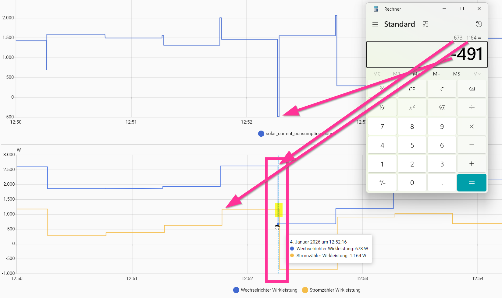 Der Wechselrichter schickt den Wert 12.52.16 und veranlasst den Sensor es neu zu rechnen. Verwendet wird dabei der letzte bekannte Werte von ein paar Sekunden zuvor (1164W) - es fällt auf Minus. Millisekunden später (ebenfalls 12.52.16 in HA) kommt dann auch der Stromzähler und das ganze passt wieder.
