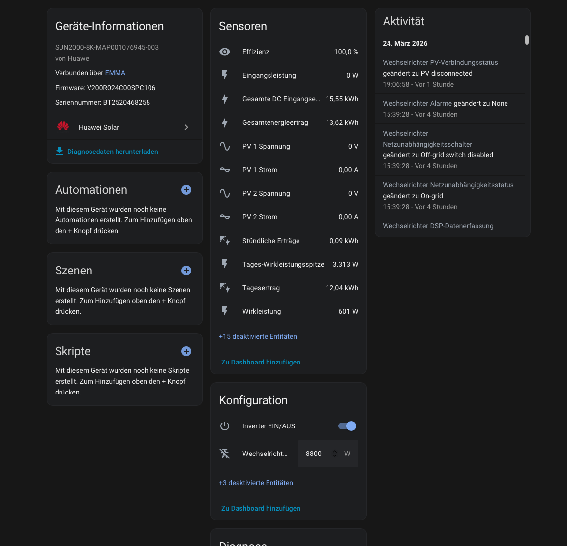 Alternative Mutmaßung, da ich Emma nicht habe, welche Entitäten verstecken sich hinter „+15 deaktivierte Entitäten“ noch? —> Laut deinem Screenshot sind ja Daten vom Wechselrichter bereits vorhanden