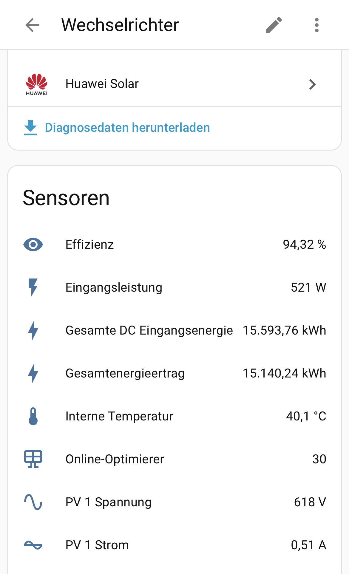 Ich danke allen. Nur leider ist meine neue Anlage etwas anders. Ich habe eine Smart Guard Box 63, einen Sun20008K -MAP0, und eine Luna 2000 5 KwH und der Wechselrichter ist leider nicht in der Integration gelistet. Der ist von Huawei brandneu und durch die Verschaltung mit der Notstrombox kommen da etwas andere Werte.