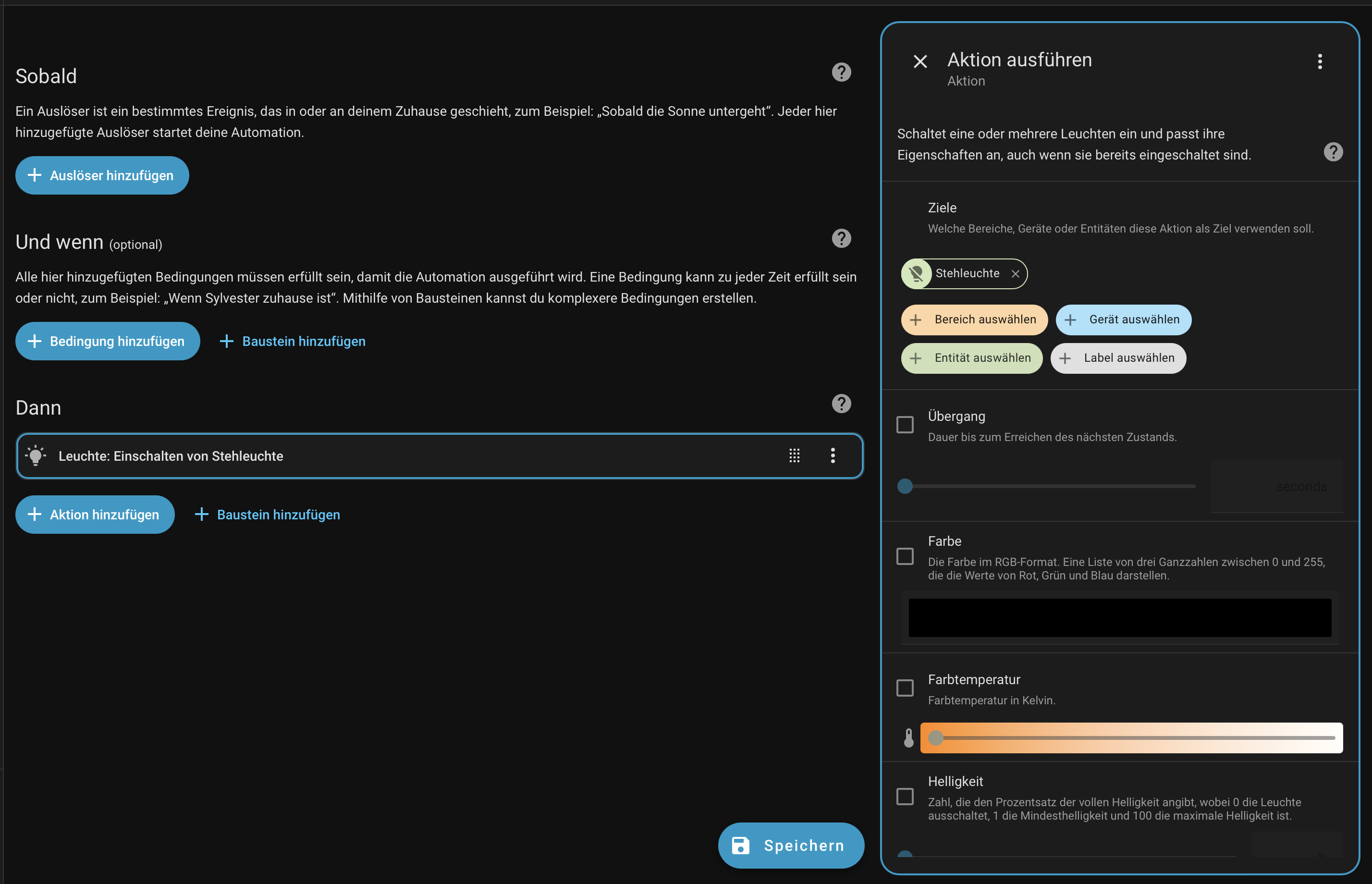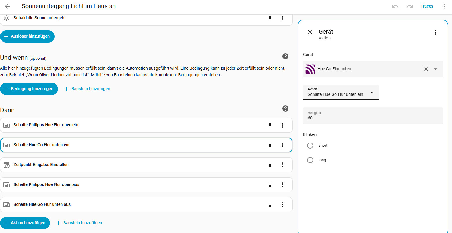 Ich lasse Lampen (Hue) bei Sonnenuntergang einschalten. Leider kann ich nur einstellen ob sie an oder aus gehen, aber ich kann keine Farben einstellen!?