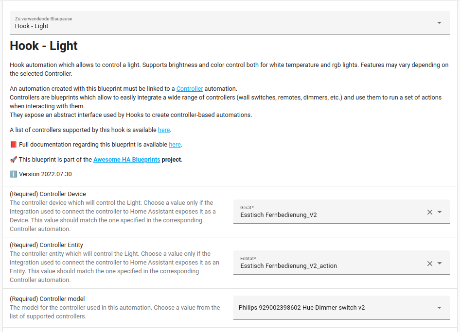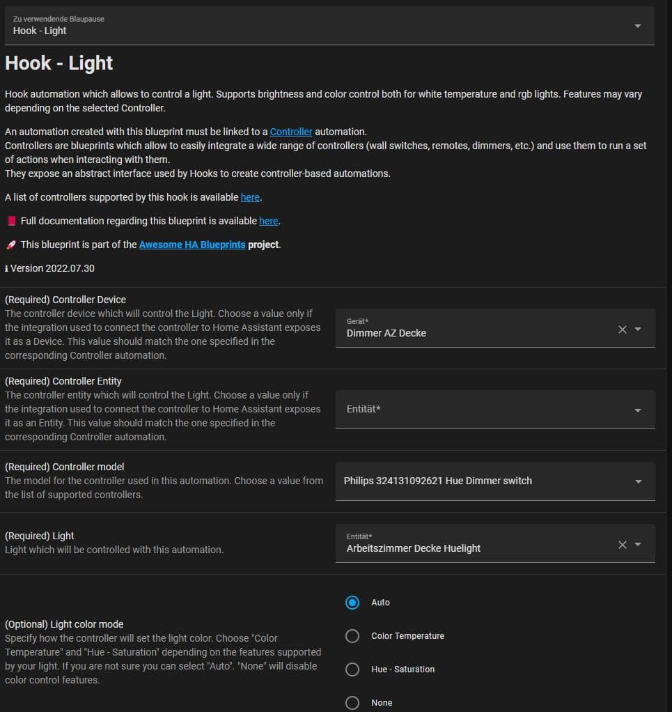Dann muss aus dem Blueprint ‘Light Hook’ eine neue Automatisierung erstellt werden. Dort wird dann die Fernbedienung und die zu steuernde Lampe eingetragen.