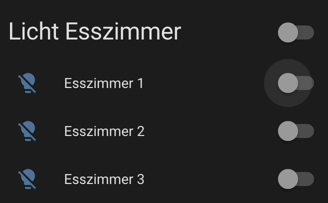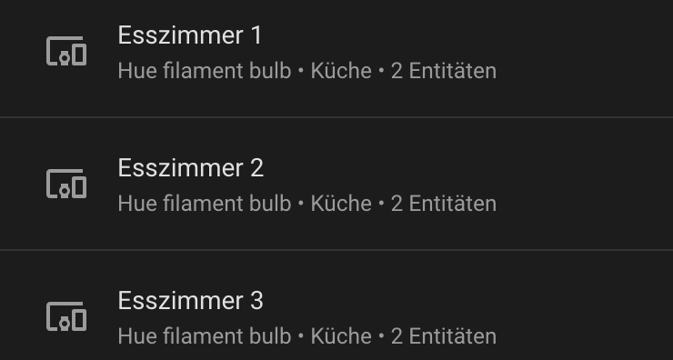 Ausgangssituation. Ich habe im Esszimmer eine Deckenlampe mit drei HUE-Birnen. Diese hab ich auch über die HUE-Integration einzeln im HA. DIese sind auch einzeln schaltbar.