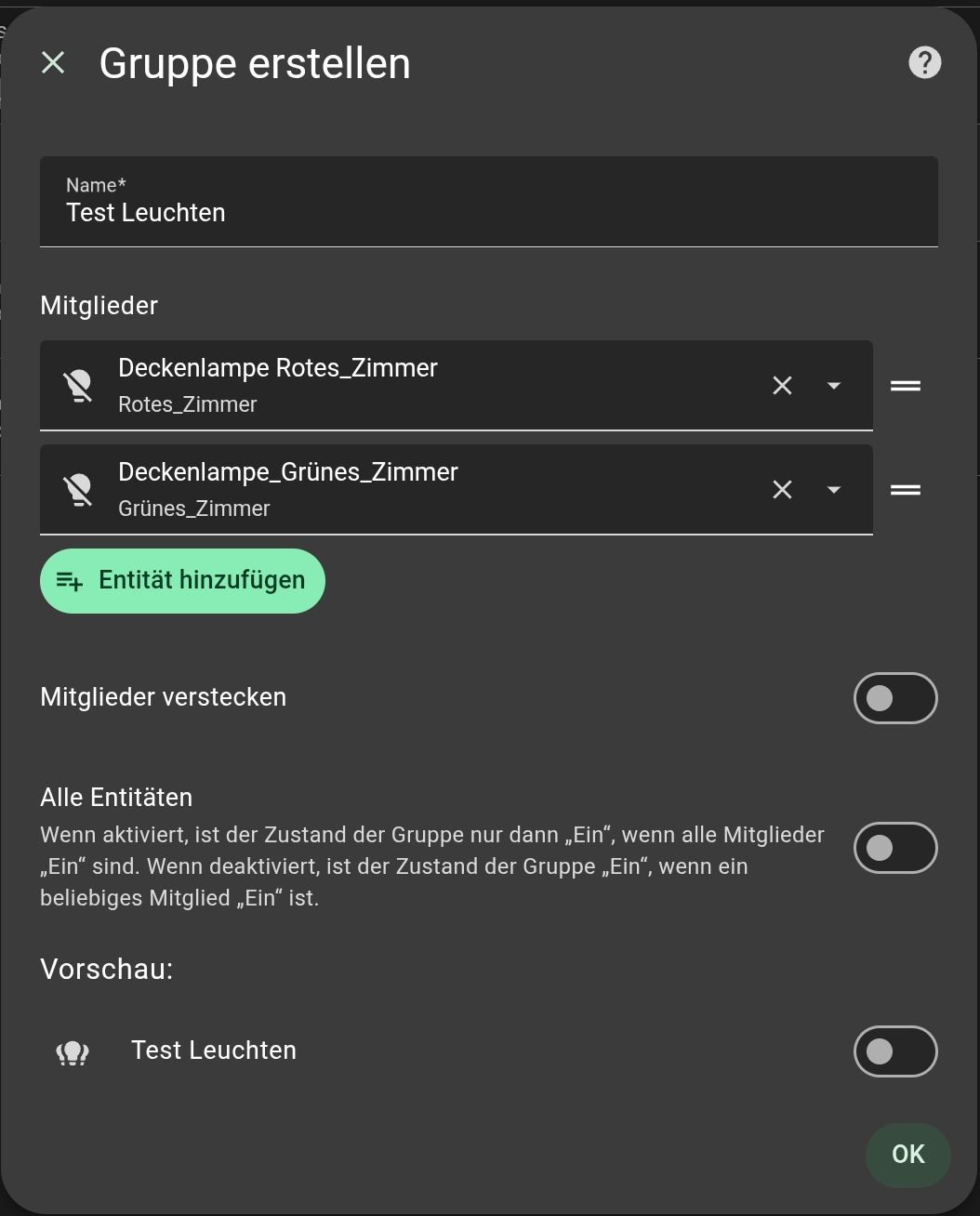 @Robeck Ich habe es gerade einmal nachvollzogen, allerdings ist meine Konfiguration eine andere. Ich habe alle Zigbee Leuchten über Zigbee2MQTT eingebunden. Sollte aber eigentlich bei der Erstellung einer Gruppe keine Rolle spielen. Wenn ich über die Helfer-Erstellung eine Leuchten-Gruppe bilde, kommt bei mir in der Vorschau der gleiche Fehler wie bei dir. Wenn ich das aber ignoriere und den Helfer trotzdem erstelle, kann ich die Gruppe ganz normal schalten. Hast du das bei dir auch getestet?