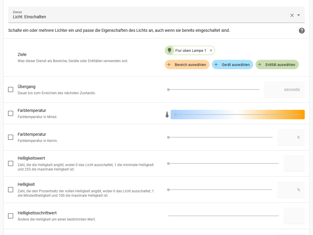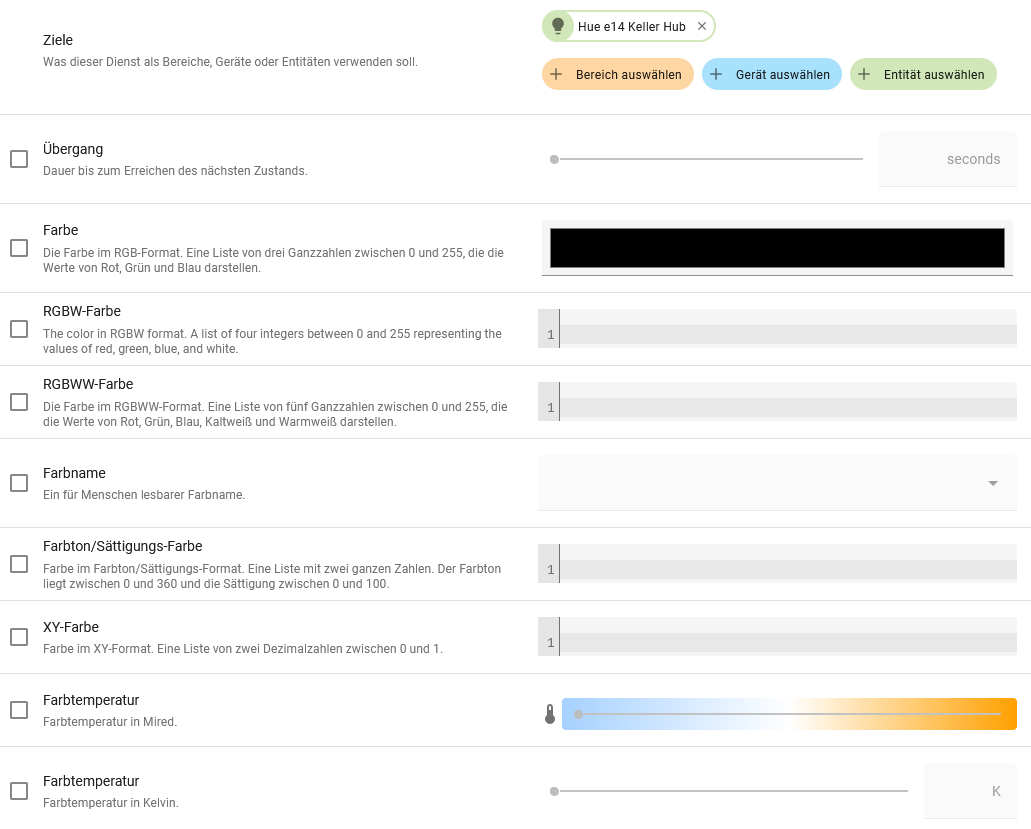 ich wollte gerade in einer Szene mit Hilfe des Services light.turn_on eine Hue Lumpe anschalten und musste feststellen, dass ich keine Farbtemperatur in z.b. Kelvin einstellen kann.