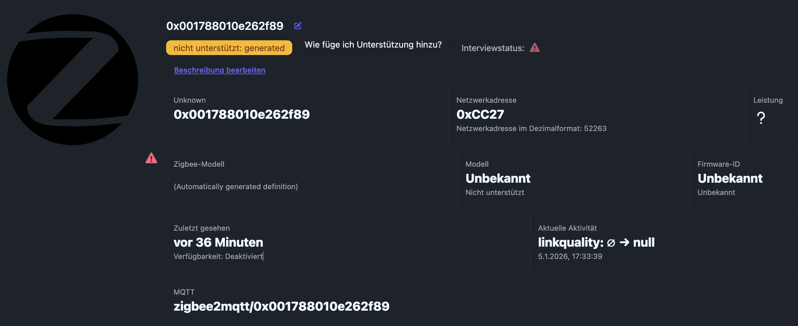 Den Wall Switch habe ich aus der HUE-App entfernt und unmittelbar danach in Z2MQTT beitreten lassen. Der Schalter wird aber aus “nicht unterstützt” angezeigt