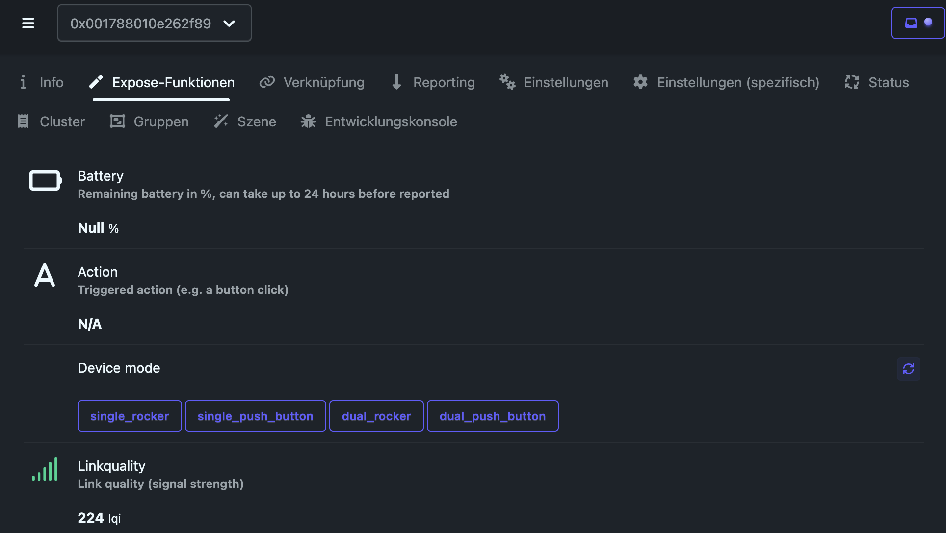 Gut, nachdem ein erneutes pairen nicht funktioniert hat, auch über die Philips Hue-App nicht funktioniert hat, hab ich den Schalter ausgebaut und über den Rest-Schalter zurück gesetzt. Sogar ein paar Mal. Keine Chance den Wall Switch wieder in Z2MQTT rein zu bringen. Also die Batterie aus dem Wall Switch entfernt, 10 Sekunden gewartet, Batterie wieder ein - und siehe da, der Wall Switch erscheint in voller Pracht in Zigbee2MQTT.