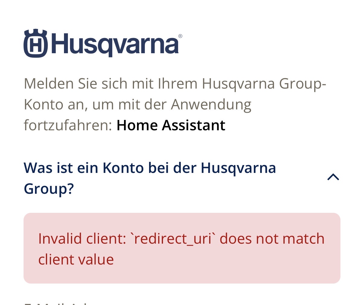 hab das gleiche Problem. Jedesmal, wenn ich die Integration aufrufe, Husqvarna suche, finde, kommt dieser Bildschirm. Es ist ein Fehler aufgetreten…. Alle Löschversuche über Handy und Erstellung neuer API bringen keine Änderung.