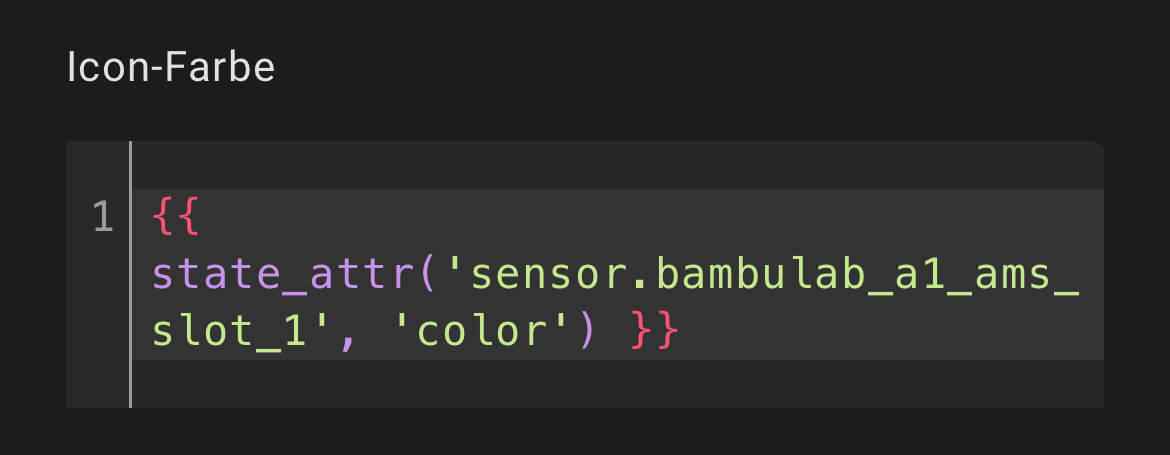 ich habe eine Entität “sensor.bambulab_a1_ams_slot_1” mit dem Attribute “color”. Als Ergebniss wird mir der Hex-Wert “#19c344” angezeigt.