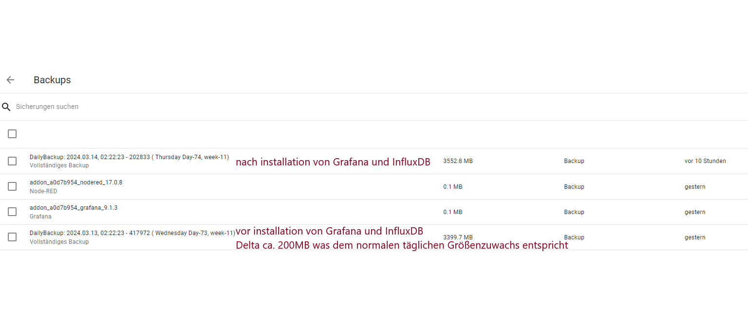 Hast du für InfluxDB -Backup in config.yaml was eingestellt? Ich habe die Backup Sizes vor und nach Influx geprüft. Delta sind 200Mb was dem normalen täglichen Zuwachs entspricht. Somit kann InfluxDB nicht mitgesichert werden. Hier der Screenshot