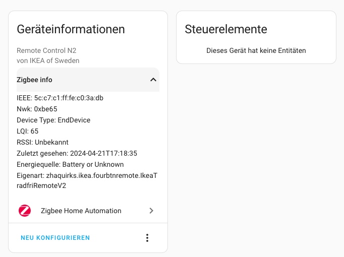 Die LEDs habe ich problemlos in ZHA integriert bekommen. Das Gerät wird erkannt, das Interview aber nicht abgeschlossen, so dass man zum Schluss einen Namen angeben kann. Wenn ich abbreche wird das Gerät angezeigt, aber ohne Entitäten. Manchmal bekomme ich zumindest den Batteriestatus, aber niemals die einzelnen Taster.