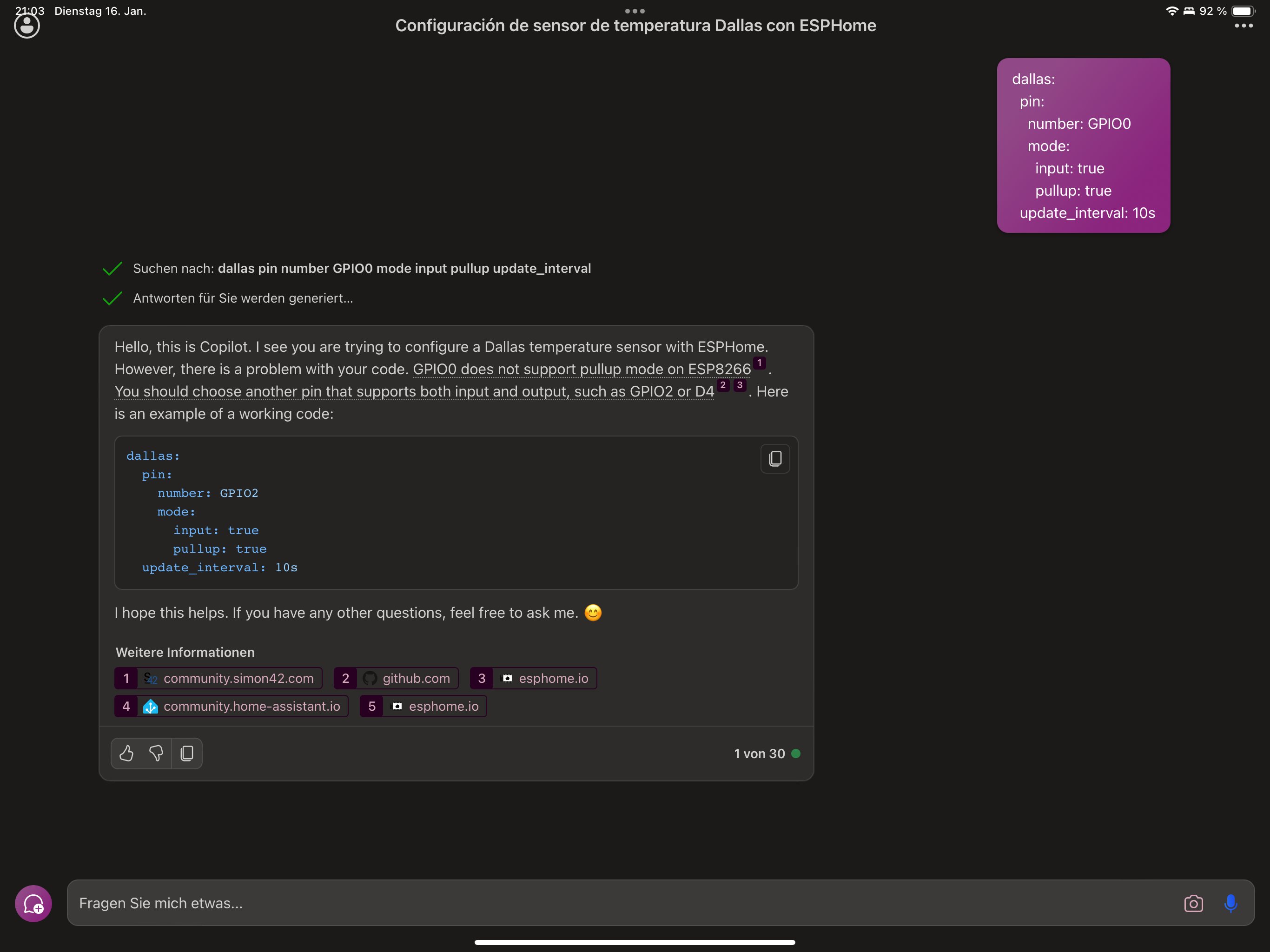 Nun wollte ich das Messintervall als Input-Feld in der Konfiguration von HA haben. Daran sind wir gescheitert. Auch die Nutzung einer globalen Variablen für das update_interval des Dallas hat nicht geklappt. Von einem Fehler zum nächsten, immer komplexerer Code, der immer mehr Fehler hatte.