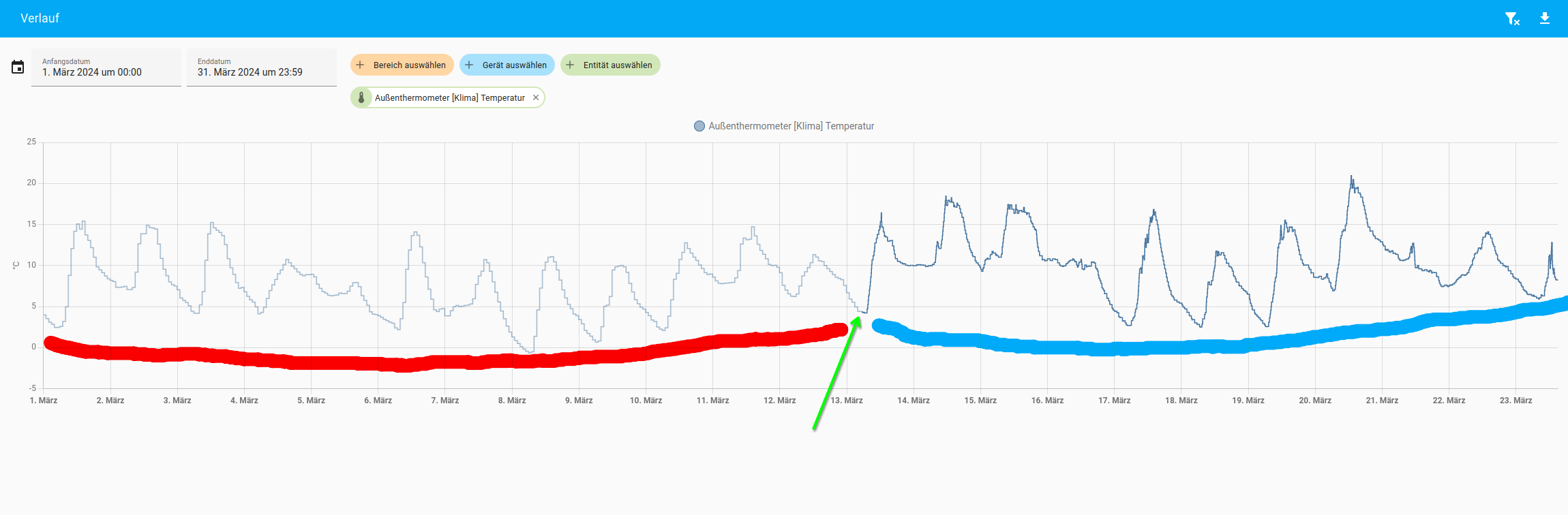nein, mit irgendeiner Version von HA, wurde das ja geändert, das, was passiert ist, dass die Daten, je älter sie werden, werden sie ungenauer, da die Daten aggregiert werden, siehe dieses Bild, das sind die Werte aus dem Februar