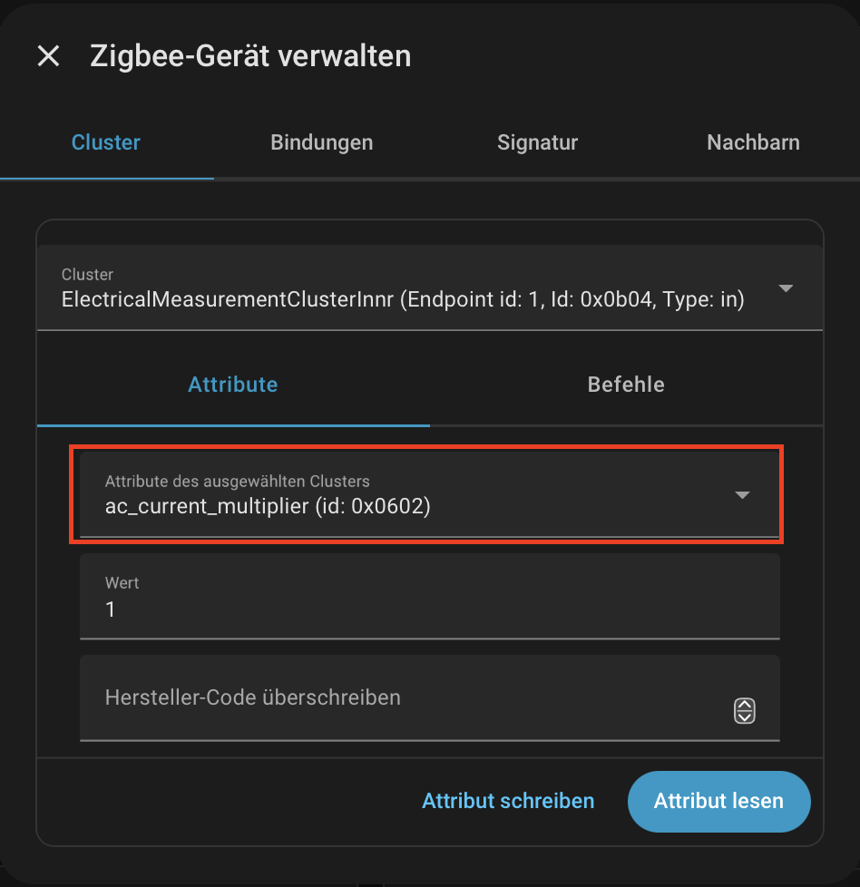Und as Attribut: ac_current_divisor bzw. ac_current_multiplier