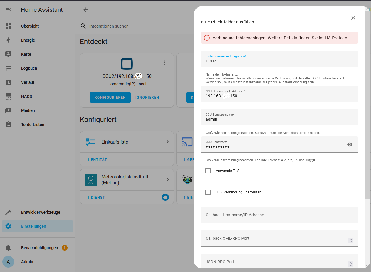 Hallo Thalion, zuerst mal vielen Dank für die Antwort. Leider hat das nichts gebracht, aber ich vermute auch das es irgend was ist mit der authenifizierung. Habe einen Printscreen meiner PaspberrxMatic VM und der Fehlermeldung in HomeAssistant.