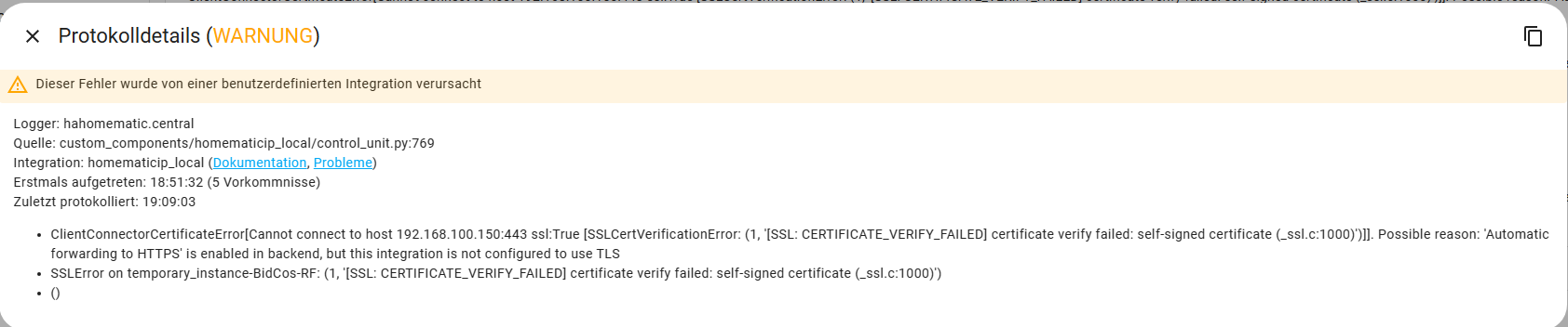 Hallo Macello, danke, Ich habe die Videos gesehen, aber wenn ich RaspberryMatic IP und Loginame und Passwort eingebe, kommt nach absenden eine Fehlermeldung ClientConnectorCertificateError[Cannot connect to host 192.168.xxx.xxx ssl:True…