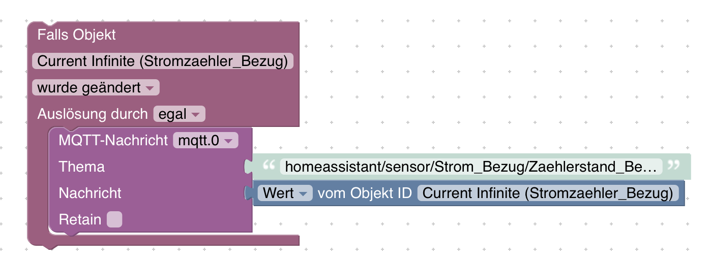 Habe dann ein Userscript erstellt welches einfach bei einer Änderung des Zählerstands den Zählerstand nochmals an per MQTT versendet.