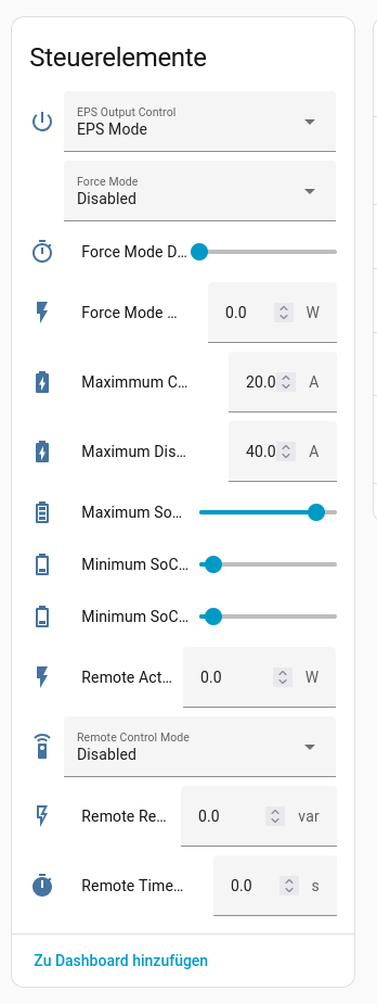 Zusammen mit einem Hichi (Tasmota) IR Lesekopf auf dem Stromzähler kann man dann die Wechselrichterleistung dynamisch steuern und entscheiden ob der Strom im Akku bleibt, oder ins Hausnetz gespeist wird.