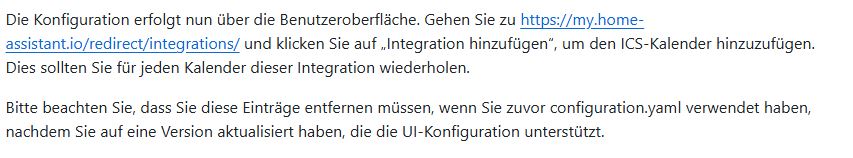 Verstehe ich nicht. Die Intergration ics-Kalender ist ja schon da. Wenn ich da drauf gehe, kann ich über “Dienst hinzufügen” einen ics Kalender hinzufügen. Also die Beschreibung ist schon verwirrend, wenn das gemeint ist, was ich gesagt habe.