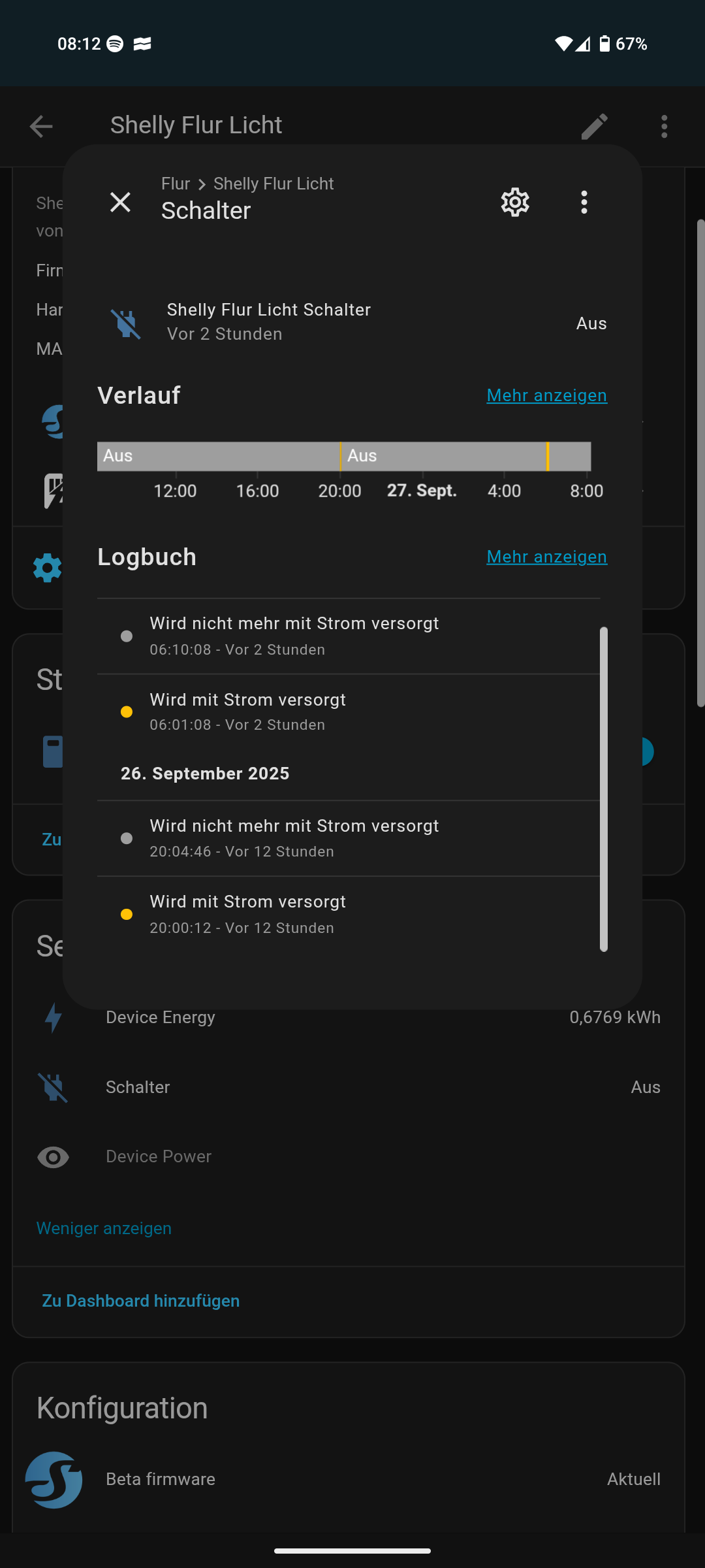 Dieses Doppel Konstrukt habe ich, damit ich auch bei Ausfall von HA / WLAN noch den Schalter bedienen kann. Denn ab dem Moment wo die Verbindung zu HA abbricht, schaltet der Shelly den Ausgang auf den Status vom Switch.