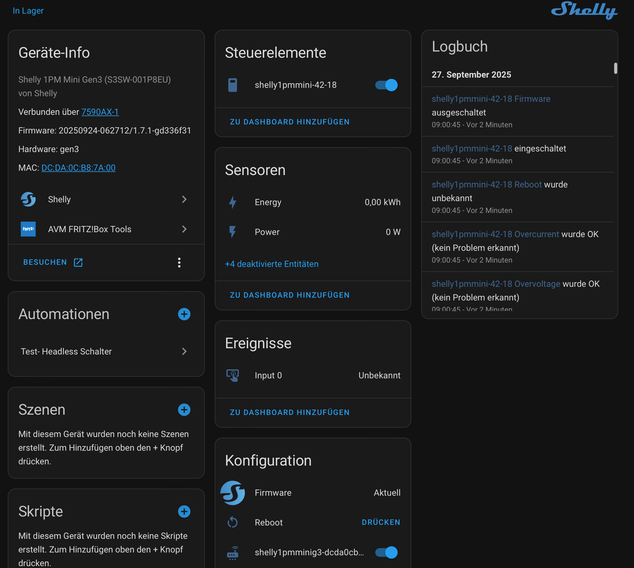 sonst, außer dem wifi, hab ich im shelly-webfrontend nichts konfiguriert. kann es sein, dass sich ein 1 PM Mini anders verhält wie die Version ohne PM? Letzteres kann ich später mal testen…