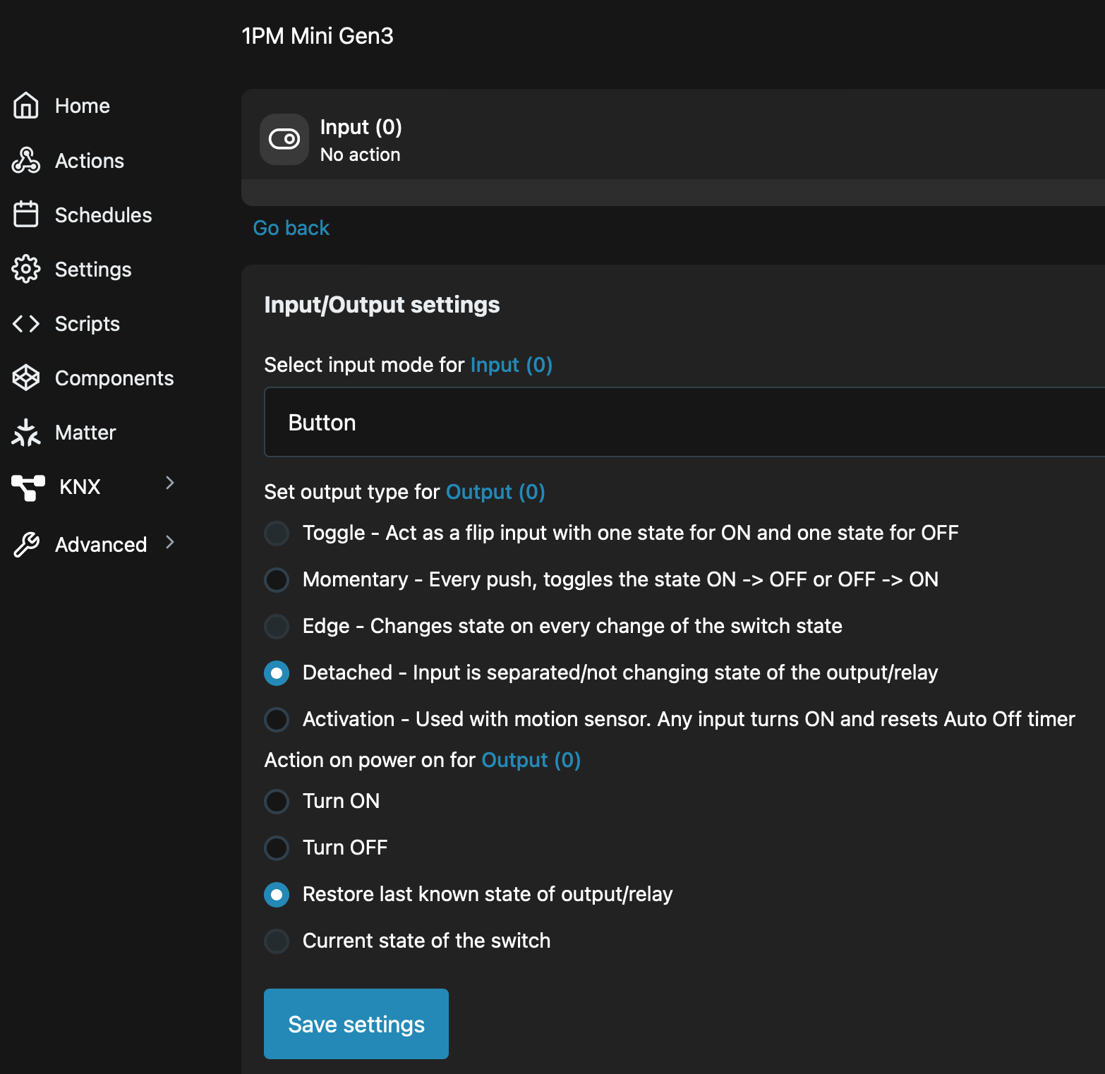 Im Shelly den Input einstellen auf „Switch“ und den Output auf „Detached“