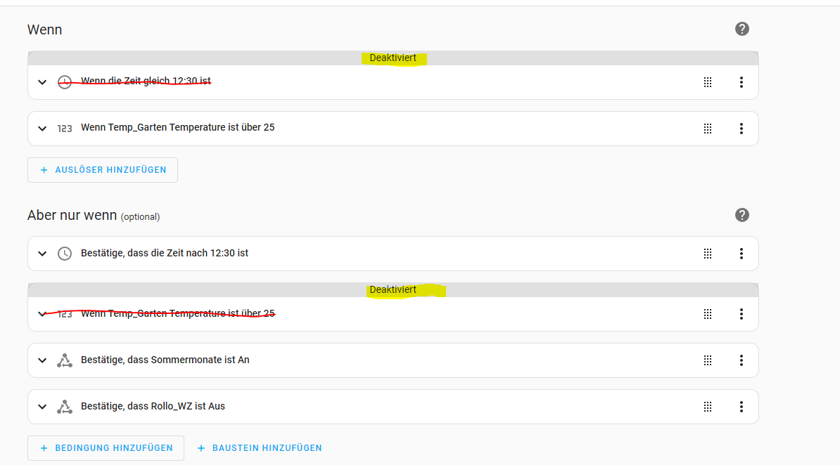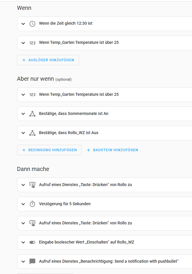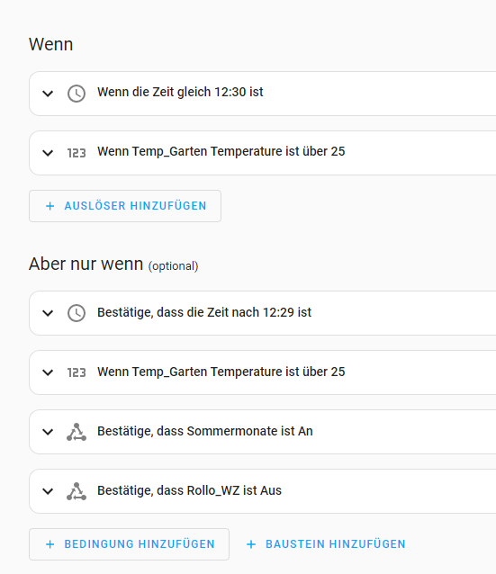 Wie man unschwer sieht, ist der erste trigger “Wenn es 12:30 ist” komplett überflüssig da der 2. trigger “Wenn es im Garten > 25°C ist” alles überschreibt.
