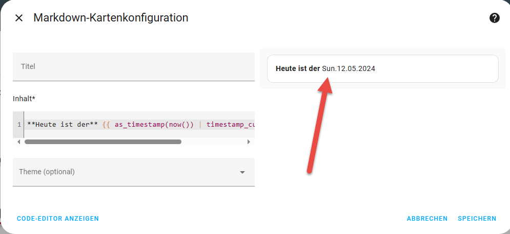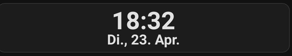 Hallo zusammen, möchte oberhalb meiner Bahnhofsuhr eine Kachel setzen mit dem Aktuellem Datum mit Heute ist der XX.April.2024. Habe das in einer Kachel geschafft, aber die Zeit ist falsch , möchte dies weglassen, da die Bahnhofsuhr genügt.