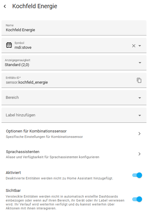 ich möchte gerne den Energiebedarf meines Kochfeldes im Energiedashboard sehen. Das Kochfeld läuft an 2 Phasen; demzufolge habe ich 2 Shelly PLUS PM Mini verbaut und mir dann einen Kombinationssensor (Helfer) erstellt in dem ich die Summe beider Shellys erzeuge.