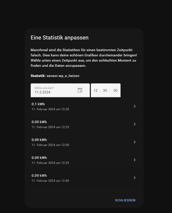 Hier ähnliches Problem. Habe in Entwicklerwerkzeuge>Statistik den fehlerhaften Wert korrigiert. Jedoch ändert sich nichts im Verlauf. Auch die Abfrage in SQLite Web zeigt, dass die Daten in der Datenbank nicht korrigiert wurden. Jetzt bin ich ratlos. Ist das in Bug?